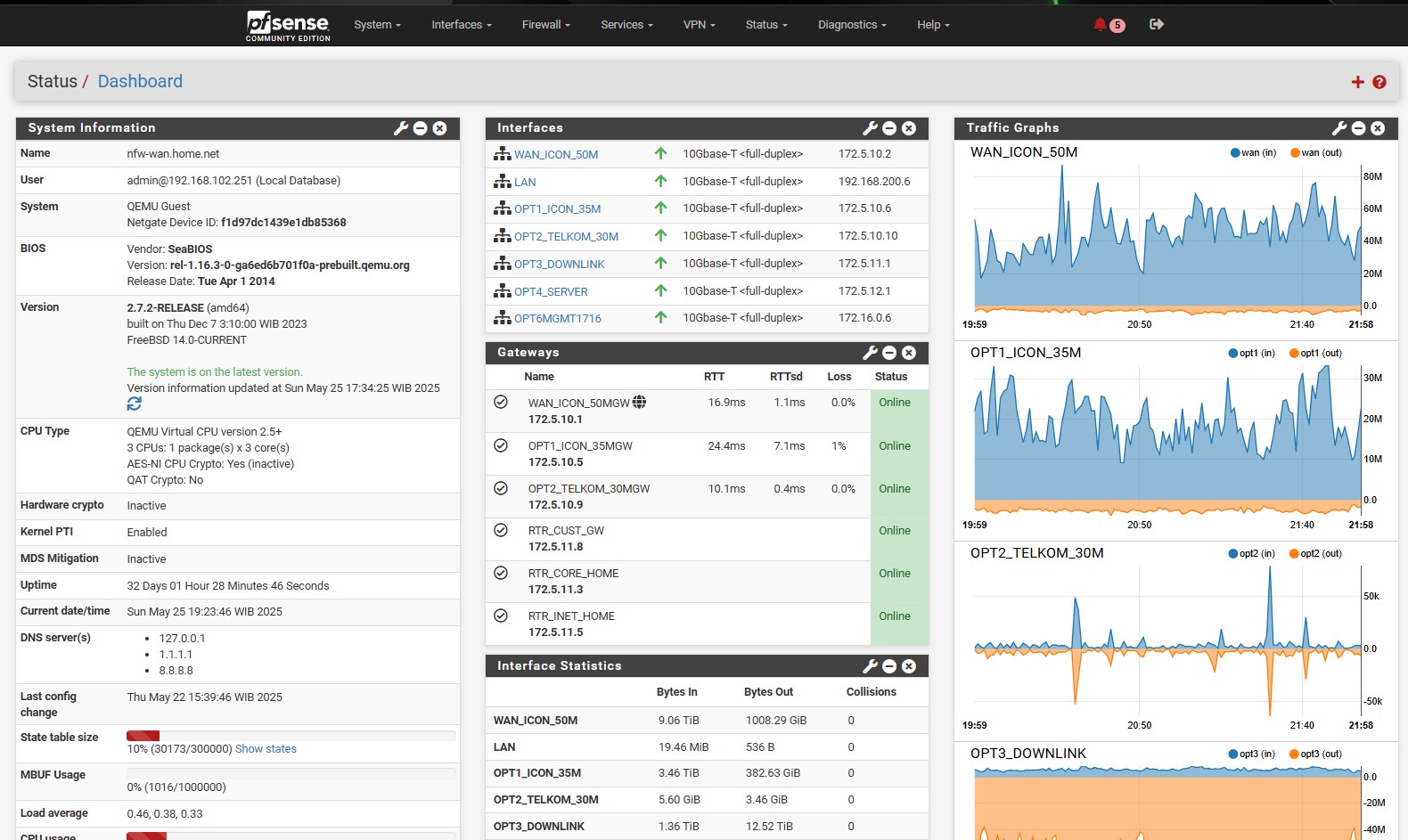 I have deployed pfSense as a critical component in my home lab, primarily to manage Internet load balancing and serve as a robust WAN firewall. This project showcases my practical expertise in network engineering, where I've configured pfSense to intelligently distribute internet traffic across multiple WAN connections for improved reliability and performance, while simultaneously enforcing stringent firewall rules to secure my internal network from external threats. This hands-on experience with pfSense has significantly enhanced my understanding of advanced networking concepts, including multi-WAN configurations, traffic shaping, and comprehensive network security practices essential for any robust IT infrastructure.
